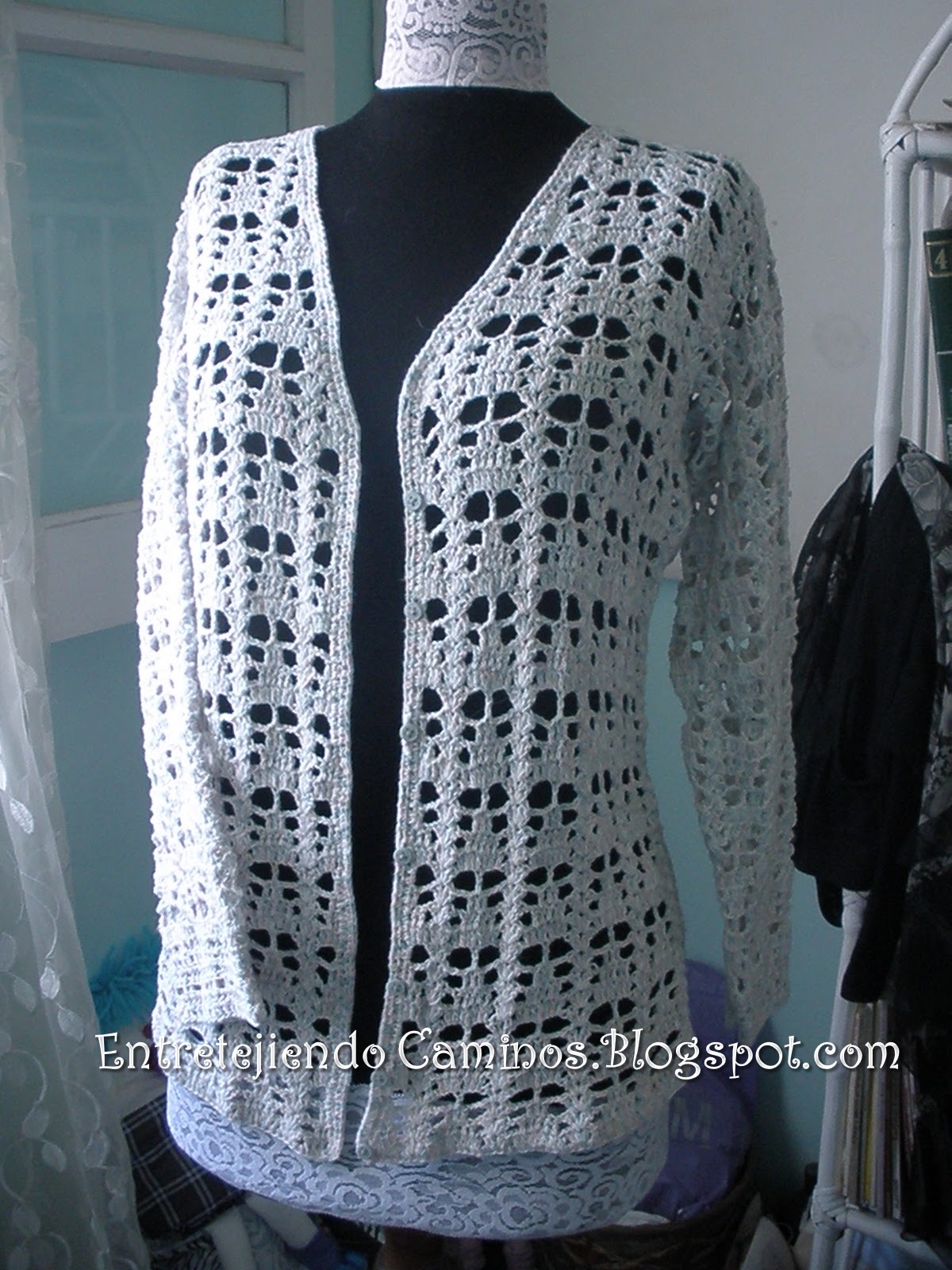 Este esta tejido con lana finita y formado por cuadros , tiene el borde con piquitos y apenas va sujeto con una cinta finita de organza y seda al tono..